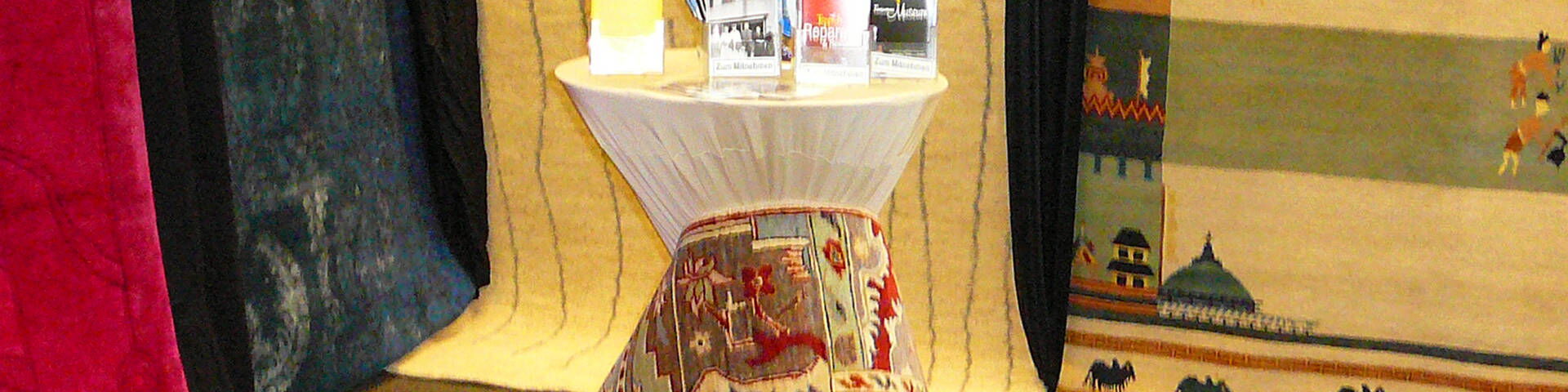 Außerdem demonstrieren wir Ihnen an unserem Stand die vielfältigen Möglichkeiten unserer großen Service-Abteilung für Teppichreinigung und Teppichreparatur, die ausschließlich damit beschäftigt ist, Ihre vorhandenen Teppiche im Wert zu erhalten. Dort beraten wir Sie zu allen Fragen rund um das Thema Teppiche.